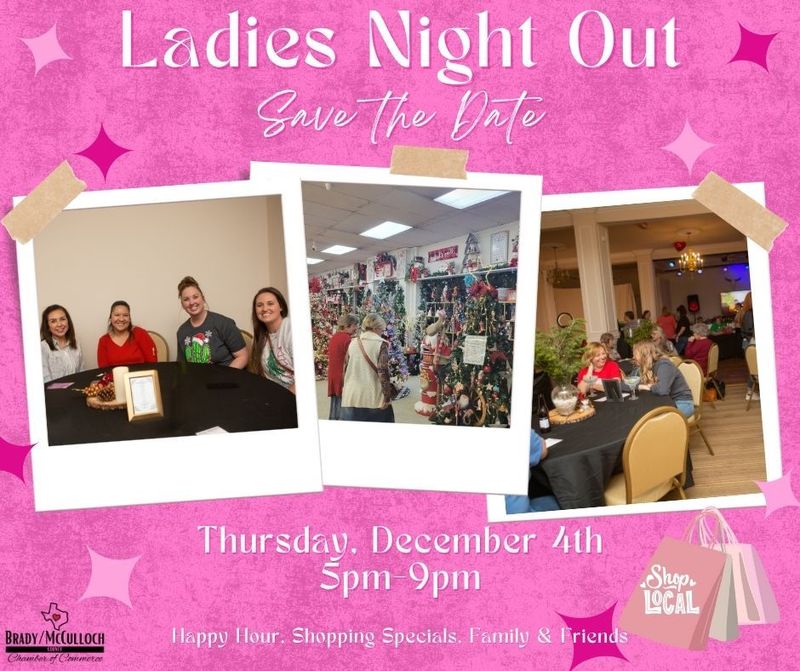 Grab your favorite ladies and mark your calendars for Ladies Night Out on Wednesday, December 4th in downtown Brady! Kick off the night with happy hour specials, then stroll through the festive downtown square to receive exclusive one-night-only shopping specials. It’s the perfect opportunity to check things off your Christmas list, support local businesses, & enjoy a fun evening out with your girlfriends.