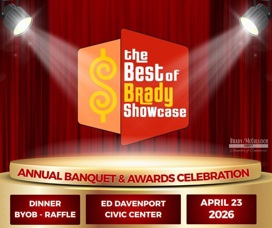 The Brady/McCulloch County Chamber of Commerce is proud to host our Annual Banquet & Awards Celebration, “Best of Brady Showcase,” on Thursday, April 23rd at the Ed Davenport Civic Center. This special evening is an opportunity to thank our Chamber members, celebrate the successes of the past year, and recognize the outstanding individuals and businesses who make a difference in McCulloch County.